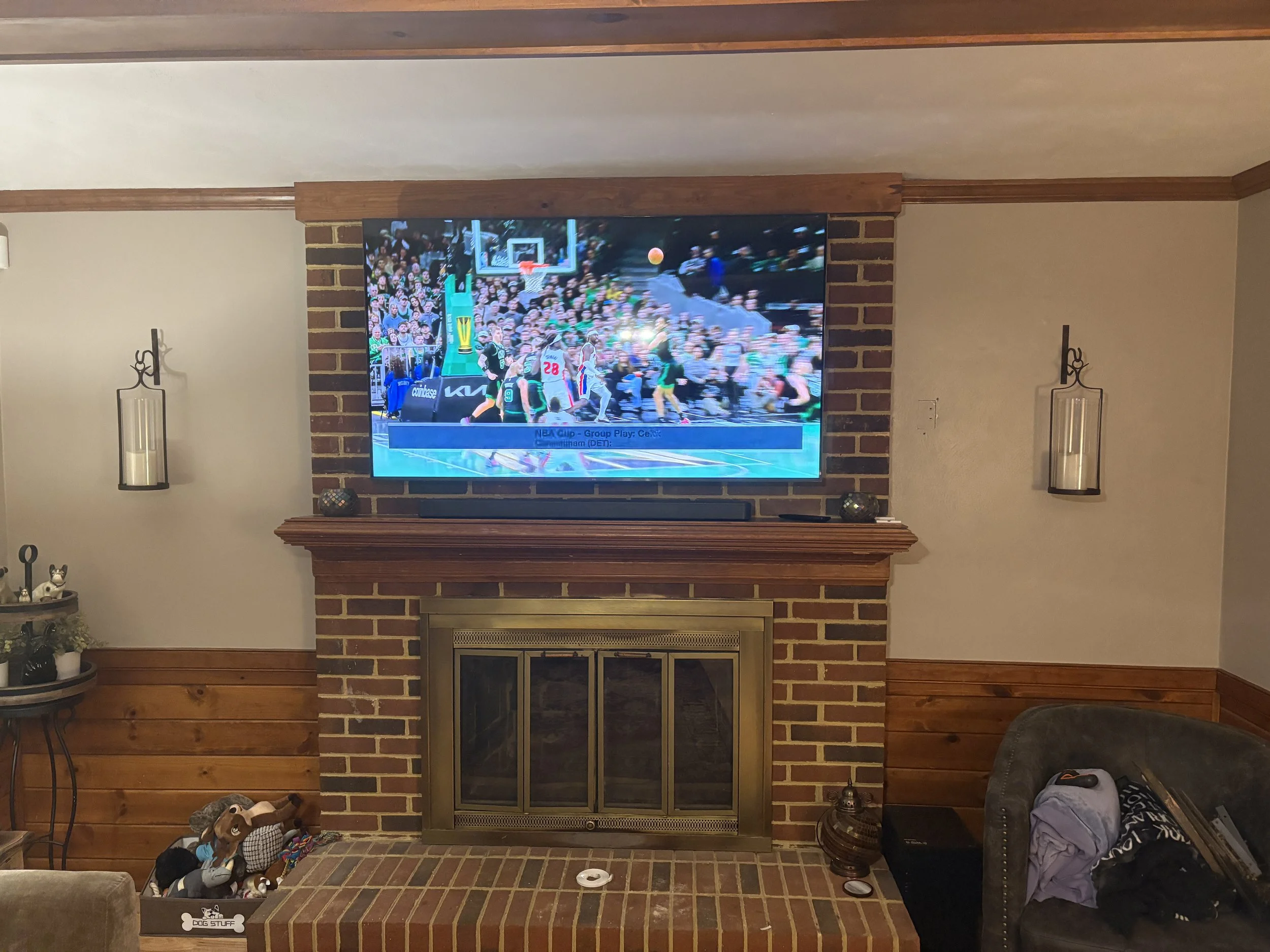86” Tv mounted above fireplace in Norfolk, Va